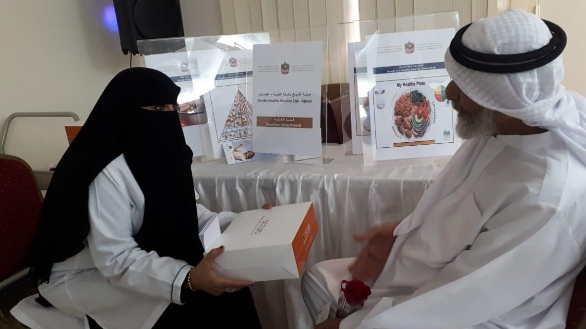 ضمن فعاليات يوم المسن العالمي والذي يصادف في الاول من اكتوبر من كل عام نظم قسم التغذيه وبالتعاون مع دار رعاية المسنين بعجمان معرض شاركت فيه المؤسسات والهيئات الحكوميه والخاصه المعنيه بخدمة كبار السن ,و قدمت اخصائيه التغذيه أمينه ثاني ال على من قسم التغذيه التابع لمستشفى الشيخ خليفه العام بعجمان ارشادات ونصائح غذائيه للمسنين وذويهم كلا على حسب الحاله المرضيه لديهم وقد تم توزيع وجبات افطار صحيه على المسنين
